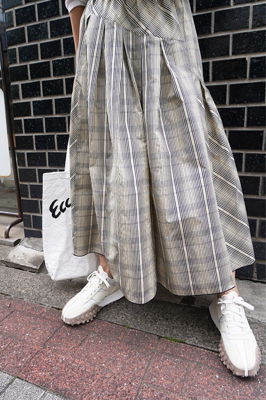 先染めのチェック柄をバイアス裁ち、ボックスプリーツで切り替えて、